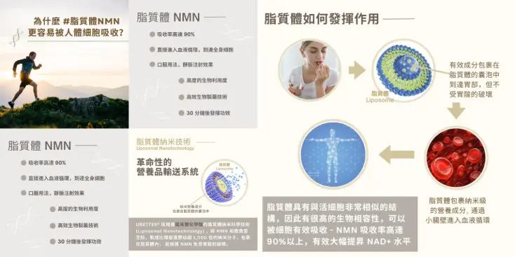 1. 帶有脂質體的NMN:由於其設計能更快進入細胞,因此可更快起效,對身體的支持作用會在更短時間內顯現。