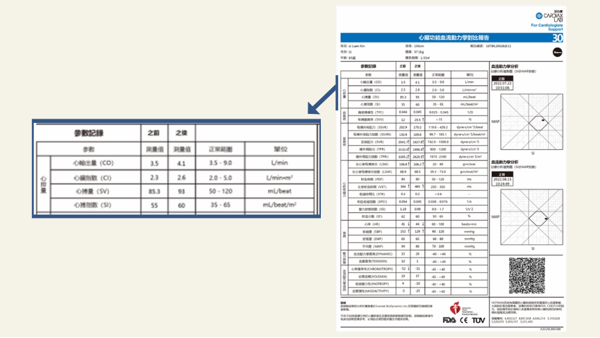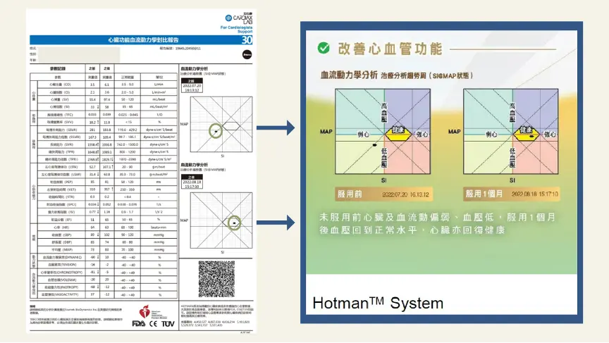 一位患有長新冠後遺症的感染患者,心臟功能減弱,表現為疲乏、食欲不振、睡眠差,服用UBETTER 脂質體NMN 靈芝一個月後,精神面貌明顯改觀。Cardiax 公司的HOTMANTM System 檢測,顯示心臟功能明顯改善,從弱心狀態恢復正常,心輸出量、心臟指數、心搏量、心搏指數均恢復正常